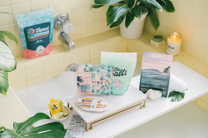 Ah, the tub. A place of warm restful healing. A place for sinus pressure and body ache relief. A place that we crave when we are feeling run down and wiped out. Start feeling better with Salty Tub Co's Cold + Flu Wipeout Bath Kit. This is kit is designed to help you detox, relax, sleep, + start feeling better from symptoms of the common cold or flu. The best part is that the detoxing happens in the solitude of your own tub! This Cold + Flu Detox Kit isn't your typical run of mill sprinkle some salt into the bath. Our kit comes with over 1.5 lbs. of Magnesium Dead Sea bath flakes and Pink Himalayan Salt, ginger root vibe bath bomb, apple cider vinegar with 'the mother' used for antimicrobial properties, a tub tab as a water dechlorinator, honey lemon tea + electrolytes. The essential oils include a healing blend of coconut, eucalyptus, lemon, frankincense, clove, and orange. Kit also includes a natural loofah to help exfoliate + soften skin. Ultimately, this combination fosters relaxation and promotes better sleep quality, facilitating a quicker recovery from illness. Everything comes packaged separately to maintain the highest purity and potency. Feel the difference of a Real Detox. Sleep better, feel better, and fight the cold and flu with our bestselling Wipeout Detox Bath Kit.